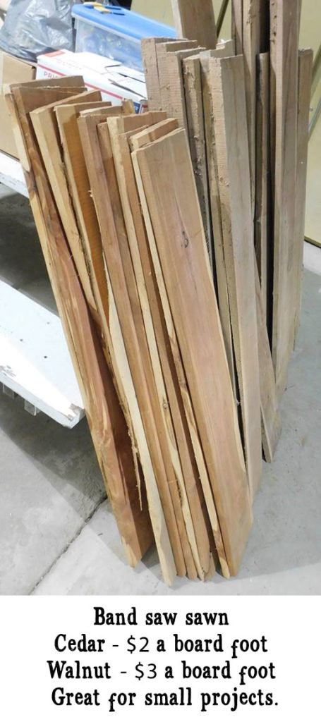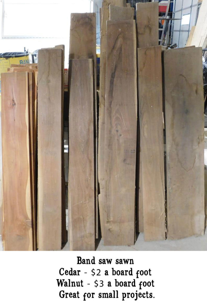 We also have a few dozen board feet of band saw sawn cedar and walnut that has been air drying for more than 20 years. Most are 3/4″ -1″ thick, 5″-8″ wide and 4′-5′ long. Cedar is $2 a board foot, the walnut is $3 a board foot.